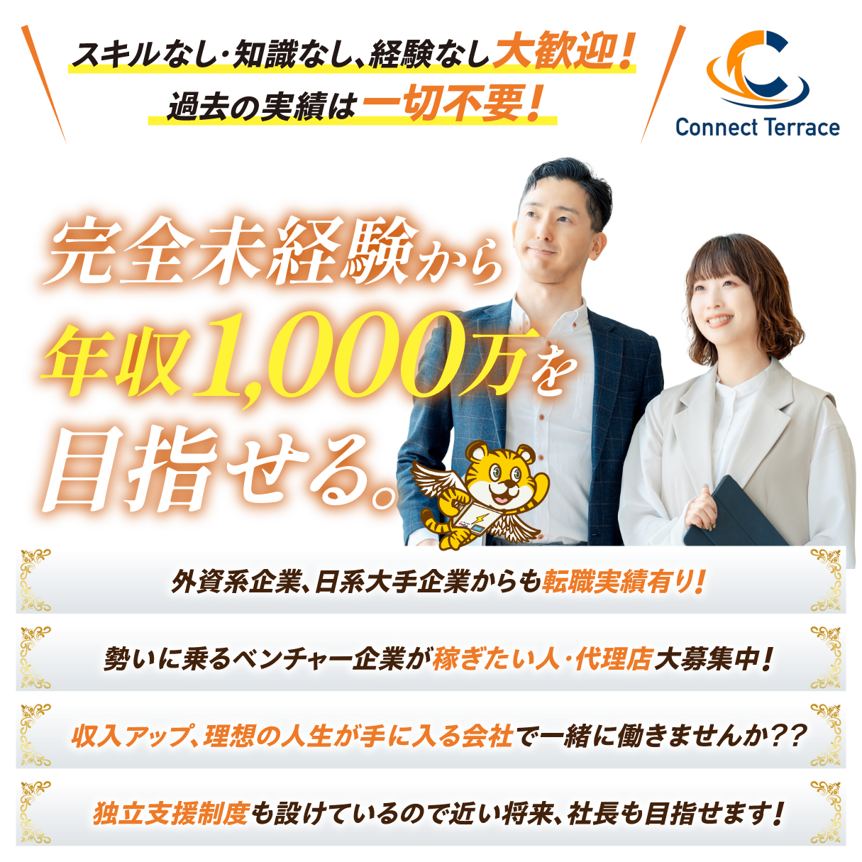 教育体制の充実 研修期間は数日から1ヶ月と未経験でも全く問題ございません。 営業商材が売りやすい 営業商材の『ハルとくでんき』は、新電力で供給量圧倒的No1の実績があるため売りやすい!! 積極的な独立支援制度 積極的に独立支援をしておりますのでメンバーの育成・管理も出来るようになったら独立を支援していきます。 ⚡ 10秒で登録完了⚡ 登録後に必ず応募しなければならないということは無く、気が向いたタイミングでラインで『面談を希望』とチャットしていただくだけなので安心くださいませ。LINEに登録するだけでコネクトテラスがどのような会社なのかの詳細をチェック出来ます♬ 友だち追加で応募する ※定員5名に達し次第ご案内を終了します。 現状の会社に満足してますか? 年収が上がらない お金も時間も余裕がない 将来に不安を感じる キャッシュポイントを増やしたい(副業できない) 自分の長所を活かせてない 労働環境に合わない人がいる 日々刺激が足りない そんな環境から一歩踏み出したいと思うなら 夢物語で終わらせない輝ける環境や役職をご用意しました。 現在の月収60万 今年度推定年収720万円 勤続年数3年、31歳、前職360万円 前職は運送業をしていたのですが、肉体的に続けるのがしんどいだけでなく収入も思うように伸びなくて今後のキャリアについて悩んでいました。 そんなとき、大木社長に働き方を相談させていただきました。 その際に、会社に依存しない『個』のスキルを身に着けどの会社にいっても通用する営業するスキルを身に着けることをアドバイスされ業種転換をしました。 また、リース事業も関わらせていただき毎月10万円のストック収益も頂いていてトータルで給与が2倍に増えて将来への不安もなくなりました。 これから事業拡大に伴い管理職としても活躍もしていきたいと思っています。 現在の月収100万 今年度推定年収1,200万円 勤続年数1年未満、33歳、前職750万円 前職は上場している大手IT企業に勤めていましたが、給与に大きな不満はなかったものの毎日同じ業務の繰り返しで正直退屈でスキルが3年目以降から向上している実感がなく将来に不安を覚えていました。 そこで大木社長に出会い電力事業の誘いを受けて一念発起で退職して株式会社コネクトテラスに入社しました。 今は新電力の営業としてプレイヤーをしながら代理店開拓のアライアンス事業も任されていて個人に任される裁量や給与が多く人生の成功に一歩一歩近づいている感じがたまりません。 これから株式会社コネクトテラスを大きくしていく仲間が応募してくれることを楽しみにしています。 今期の年商 2400万円(予定) 独立してからの年数1年未満、30歳前職年収1500万円 従前、外資系の営業にてトップセールの実績を残し年収も1,500万と順調ではあったものの会社に依存する生活から脱却したく副業で最初『ハルとく電気』の販売を開始して稼働わずか10日未満で利益100万達成! その後脱サラして代理店となり人生が変わり充実した生活を送れて株式会社コネクトテラスには感謝しかありません! 株式会社コネクトテラスは、一緒に働いてくれる営業担当や 代理店(個人事業主含)様を募集しております 社会人経験が浅くても営業未経験でも大丈夫です。 若手のキャリアアップをサポートしている 弊社代表『大木』があなたを一流の社会人に育て上げます。 営業するなら株式会社コネクトテラス 3つの理由 1 営業未経験でもトップセールス!! 洗練された教育システム 弊社の教育は営業スキルを教えるだけではなく、 営業としてのマインドやリーダーシップの持ち方、 独立の支援など、人間として成長することが可能です。 2 年収1000万も夢ではない! 利益を即反映する給与体系 当社はインセンティブ制度を採用しています。 自分の実力と共に収入もアップしていく合理的な仕組みなので 努力は必ず報われます。 3 異業種へのキャリアップから独立まで視野に! 従業員の方のキャリア構築を第一に考えています営業全メンバーの『市場価値』を高めてどこにいっても活躍できる人に育てます。 関連会社(8社)へのキャリアアップや人材紹介事業も行っているので自身の『市場価値』を高めたのちに異業種へのキャリアサポートも可能です。 あなたの望むキャリア構築を全力で会社で支援していきます!! 採用の流れ LINEorDMにて申込 WEB面談 採用 Q&A Q: 営業開始までに必要な準備は沢山ありますか? A: いいえ、すぐに動いていただけるよう、営業ナレッジ(提案資料、トーク・メールスクリプト、各種資料)や技術面、管理面のことは私たちが行うため、 営業に一点集中していただけます。そのため、本来必要なシステムや知識、人材など大掛かりな設備も不要です。 Q: どれくらい稼げますか? A: 1人の営業マンの月間の平均獲得数が25地点(1電力の契約の手数料平均が5.5〜6万円)で150万前後の売上が見込めて経費は人件費を除いて交通費などしかかかからないため数%の原価率になるので高粗利が見込めるので営業