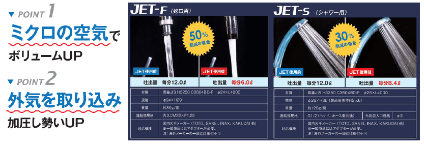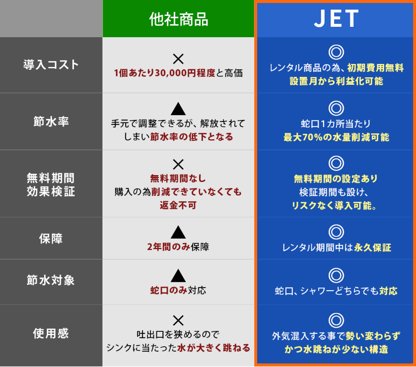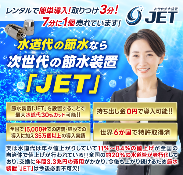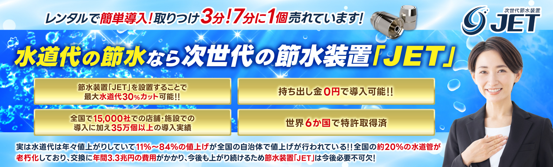 JETを設置後も普段通りに使うだけ!水道代金が "最大30%" も削減可能です。 詳細はお問い合わせはこちらから 導入されている施設 知ってますか? 実は水道代は年々値上がりしていて11%~84%の値上げが全国の自治体で行われています。 全国の約20%の水道菅が老朽化しており、交換に年間3.3兆円の費用がかかるため今後も水道代が上がり続けるため節水装置『JET』は今後必要不可欠になってきます。 次世代節水装置『JET』が選ばれる5つの理由 取り付け実績25万個以上 現在JETの取り付けの実績は25万個以上。多くお客様にご満足頂いております。 Reason.01 持ち出し金0円で導入可能 削減できた水道料金から使用料をお支払いできるので費用を用意する必要はございません。 Reason.02 初期費用施工費0円 装置などを取り付けや、レンタルにかかる費用。JETでは全て0円で提供しております。 Reason.03 メンテナンスフリー 安心のフリーメンテナンス(何か不具合があればご連絡下さい。) Reason.04 使用感へのこだわり 節水はしたいけど、使い心地が気になる方も多いと思いますが、JETは使い心地を損なわずに節水する事が可能です。 Reason.05 従来の節水方法の問題点 節水効果があるも使用感も落ちた 使い勝手に不満があり蛇口を多く開けてしまう 水量が少ないので使用時間の超過 節水装置『JET』は今までの節水装置とまったく違います!! で節水できる仕組み 水圧・使用感が変わらないのに、使用箇所の水を30%~50%の節水が可能!※シャワーであればヘッドとホースの間、蛇口は先端にペットボトルの蓋2個分くらいの装置を簡単に取り付けるだけ! JETのポイント4点 ミクロの空気でボリューム感UP 外気を取り込み加圧することで勢いUP 水跳ねしないので衛生的 ブースター8段階調整にて用途に合わせて適量に可能 日本をはじめ世界6ヶ国にて特許を取得してます。 節水装置『JET』の実機デモ動画はこちらから ※蛇口は最大50%削減可能 ※シャワー用は最大30%削減可能 導入されている施設 飲食店・フィットネスクラブ・ホテル・病院介護施設・学校・幼稚園・スーパー・小売店・カラオケ・ネットカフェ等での導入事例にてご利用者様の年間利益が高い為非常に満足頂いてるお声をたくさん頂いております。 他社比較 既存水量から、装置削減後の水量において【JET】であれば最大30%程度削減できます。 ※他社では最大でも20%以下の削減となっております。 節水装置『JET』提供メーカー代表インタビュー よくある質問 水減ると使用感が悪くなりサービス低下にならないの? 特許技術により使用感は変わりません。外気を取り込むことで優しい肌間となります。 水量が減ると使用時間が長くなるのでは? 外気を細かな泡状で取込、その泡をシャワーの末端まで保つことができるので、洗浄力は上がり使用時間は逆に短くなります。 どのシャワーにも施工できるの? ほとんどがそのまま設置可能ですが、稀にアダプターが必要となるケースがございます。 その箇所でも節水できるの? 水を溜める箇所(寸胴やバスタブ等)に設置しても効果は得られないので取り付けしません。※設備によってできない場合がございます。 運営会社 社名 株式会社NextLine HP http://www.nextline-mm.jp/company/ 役員 代表取締役 太田 雅也 取締役 大木 幸哉 E-mail sales@nextline-mm.jp 事業内容 ①節水装置『JET』の販売②新電力の販売③軽バンのリース事業④人材紹介事業 JETを設置後も普段通りに使うだけ!水道代金が "最大30%" も削減可能です。 詳細はお問い合わせはこちらから