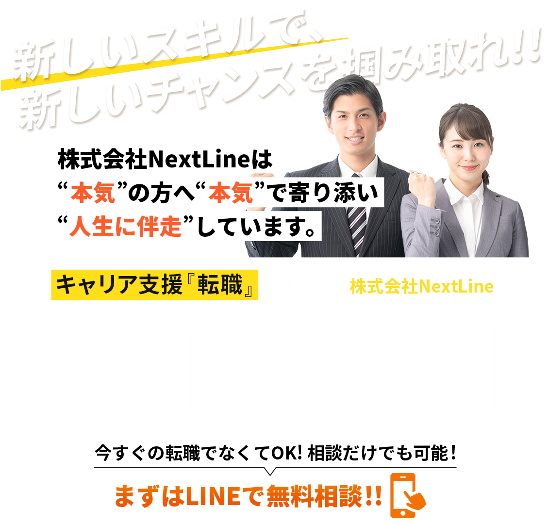 キャリア支援『転職』を頼むなら株式会社NextLine 1 プロのコンサルタントによる伴走型のキャリア支援 採用のプロとなる採用コンサルタントが支援するため企業理解に強いだけでなくキャリア設計からプロに何度でも相談が可能 2 年収UPの実現&面接通過率が高い 弊社独自の書類通過率の高い書類作成方法や内定率の高い面接対策を無料で伝授を行うので他の転職エージェントの会社よりも年収UPが見込めるだけでなく通過率も高い。企業との条件交渉なども弊社側で実施 3 数多くの未公開求人の紹介が可能 弊社及びキャリアコンサルタント独自のコネクションを使い企業開拓をおこなっているので他求人媒体では掲載されていない未公開求人(上場企業や独占求人)が多数 転職支援実績例 営業(求人広告) ▼ 営業(コンサルティングセールス) 小〜大学まで野球部に所属 新卒入社後、広告の営業として人材業界での新規〜既存営業に従事 より営業としてキャリアアップしていくため転職を決意 24歳/男性/大卒 営業(衣類代理店営業) ▼ 営業(セールス) 小〜高校までサッカー部に所属 新卒入社後、国内‧国外営業を経験。 インドネシアなど海外での新規工場の開拓営業に従事。 営業としてキャリアアップしていくため転職を決意 27歳/男性/大卒 営業(マーケティング) ▼ コンサルタント 新卒でグローバル展開のアパレルブランドに入社 国内店舗の営業を経験したのちに、マーケティング部に所属 アジア圏の商品マーケティング、グローバルマーケを担当し 現在は経験を活かし、コンサルタントに従事 28歳/女性/大卒 営業(インサイドセールス) ▼ 営業(インサイドセールス) 営業(インサイドセールス)→営業(インサイドセールス) 人材派遣営業として、インサイドセールスに従事 同ポジションとしてよりワンランク上のステーを目指し 転職を決意 25歳/女性/大卒 転職までの流れ 約1週間 転職準備 面談を通してあなたを客観的に分析しキャリア設計を実施 ▼ 書類作成 書類選考通過のノウハウや履歴書、職務経歴書のサンプルデータを提供しあなたの書類作成をフォロー ▼ 1か月 求人募集 面談で聞いた希望条件をもとにあなたに合う求人を提案・応募 ▼ 1か月 面接 企業の選考の特徴をもとに面接対策を伝授&企業へのフォローも実施 ▼ 内定 内定・退職:内定後の年収。条件交渉を代行 まずはラインで無料で相談!! 転職エージェントを利用するにあたっての5つのポイント Point01 キャリアを見据えた転職を転職のプロに相談してみる 将来的なキャリアビジョンがある方は、転職に成功した多くの方々の実績やデータのストックがある転職エージェントのキャリアアドバイザーに相談するといいでしょう。最終的な目標に向けて、どういったスキル、経験を磨いていけばよいかといった観点から、転職活動の進め方や転職先選びのアドバイスを受けることができます。 Point02 非公開求人もチェックして選択肢を広げてみる 転職サイトや転職情報誌の求人情報では、なかなか思うような転職先が見つからない場合もあります。転職エージェントは多くの非公開求人を保有していますから、選択肢が広がり、より有利な転職ができる可能性が高まります。 Point03 書類添削や面接対策を活用して内定の可能性を高める 転職活動においては、履歴書・職務経歴書や面接でいかに採用担当者にアピールできるかが転職に成功するか否かの大きなカギとなります。転職エージェントでは、業界に精通し、紹介企業の情報も豊富に収集しているキャリアアドバイザーが各企業に合った書類の書き方、質問への答え方をアドバイスしてくれますから、内定を得る可能性を高めることが期待できます。 Point04 入社後のイメージなど不安なことはその都度聞いてみる 転職先の企業に入社した場合、その企業のカラーや社風になじむことができるかどうかは非常に気になるところです。 しかし、事前の企業研究や情報収集ではなかなか入社後のイメージまではつかむことができません。その点、転職エージェントであればキャリアアドバイザーや企業担当が各企業と密に連携して情報収集に努めていますから、それぞれの企業の雰囲気なども知ることができます。 Point05 給与など条件交渉もエージェント経由でお願いしてみる 給与や労働時間、休暇といった条件は転職先を選ぶ際の重要なポイントとなります。内定後に企業側と話し合うことになりますが、転職する側からは条件を提示しにくいものです。転職エージェントでは、そうした条件交渉も代行してもらえますから、自分では交渉しにくいが妥協はしたくないという方はエージェント経由で交渉をお願いしてみるといいでしょう。 よくあるQ&A 本当に無料ですか?どうして無料なのでしょうか? 弊社の各種サポートは、すべて無料で受けることができます。なぜなら、企業から支払われる「紹介手数料」によって運営されているからです。転職エージェントを経由して募集をかけた場合、採用が決まったら、企業はエー
